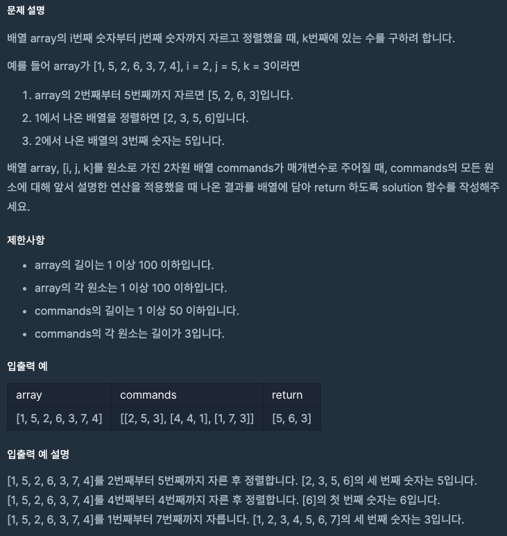 (i ~ j 번째를 자른 결과) 넣어준다. 그 후 정렬을 하고 정렬된 리스트의 i[2]-1 인덱스(k를 의미함)에 접근하여 answer 리스트에 원소를 추가하여 준다.