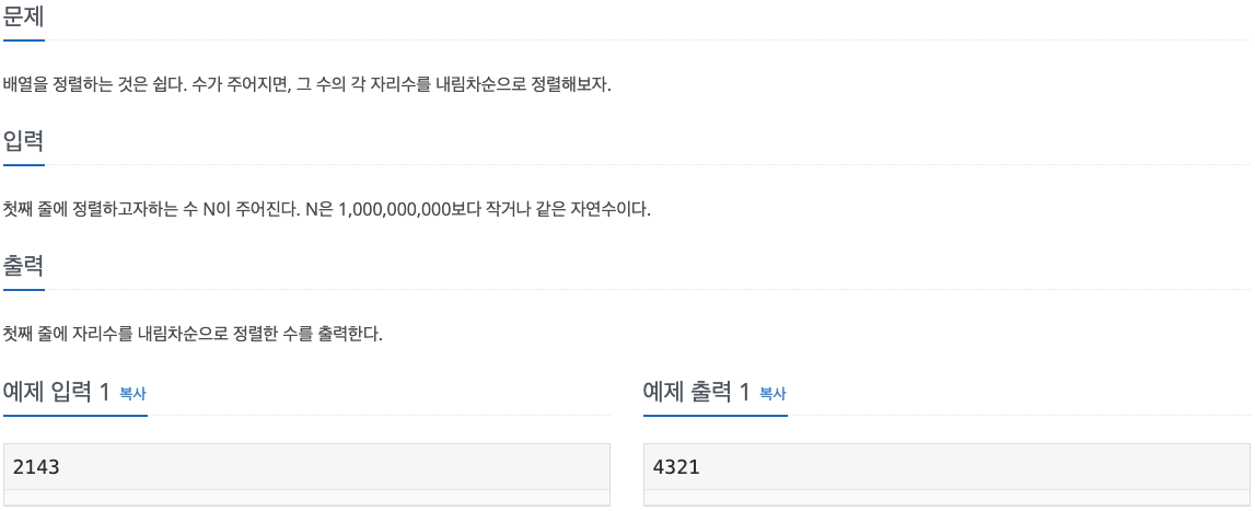 문자열로 입력을 받은 후 내장 정렬 함수인 sort를 통하여 내림차순으로 정렬한다. 리스트로 결과가 반환되기 때문에, join 함수를 통하여 하나의 문자열로 만들어서 출력하여준다.