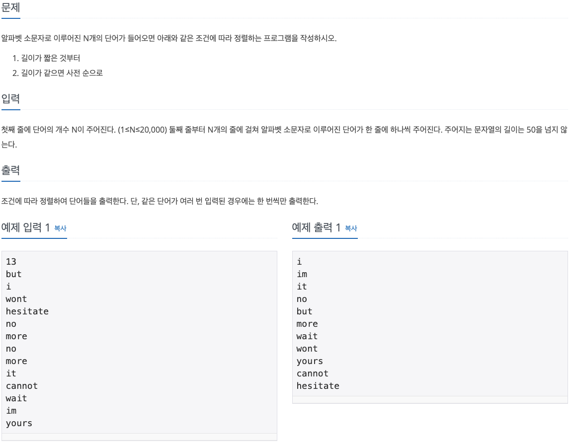 우선 a 리스트에 입력 문자들을 전부 할당한다. 그 후 sort() 함수를 이용하여 정렬하는데 첫 번째 기준은 문자열의 길이이고, 두 번째 기준은 오름차순으로 정렬한다. 또한, 중복을 제거하기 위하여 빈 리스트를 활용한다. a 리스트의 요소들을 반복문으로 돌면서 b 리스트에 복사하는데 중복인 요소가 있을 경우는 제외시킨다. 그 후 b 리스트를 출력시키면 완료된다.