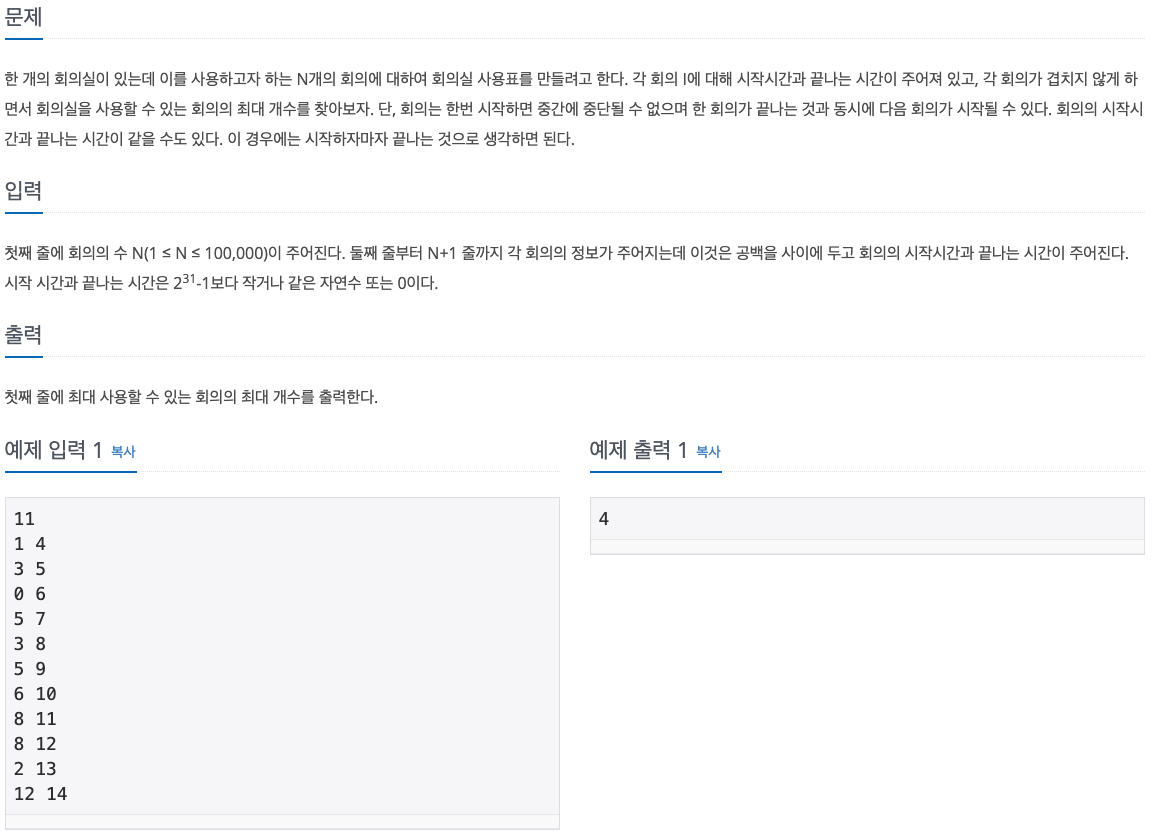 Point : 회의의 끝나는 시간이 가장 적은 것이 중요하기에, 이를 기준으로 정렬을 하여야 한다. 그 뒤에는 끝나는 시간보다 시작시간이 작으면 회의실을 이용할 수 없기에 그 부분에서 통과되는 것만 카운트하면 최대 회의수를 구할 수 있게 된다.