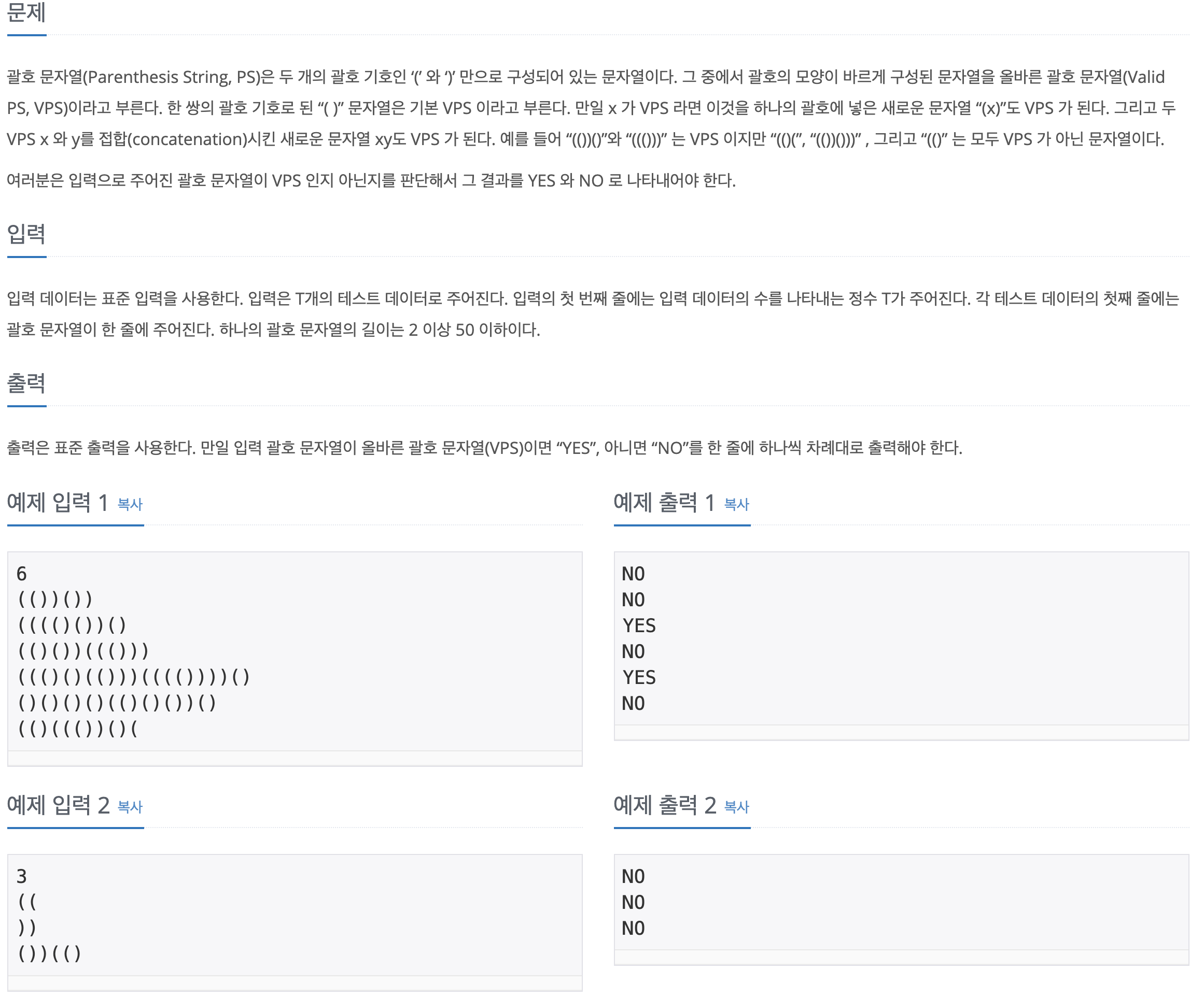 만약 문자가 "(" 라면 스택에 넣는다. 문자가 ")" 일때 만약 스택에 아무 것도 없다면 "NO"를 출력한다. 스택에 값이 존재한다면 "("를 pop 한다.