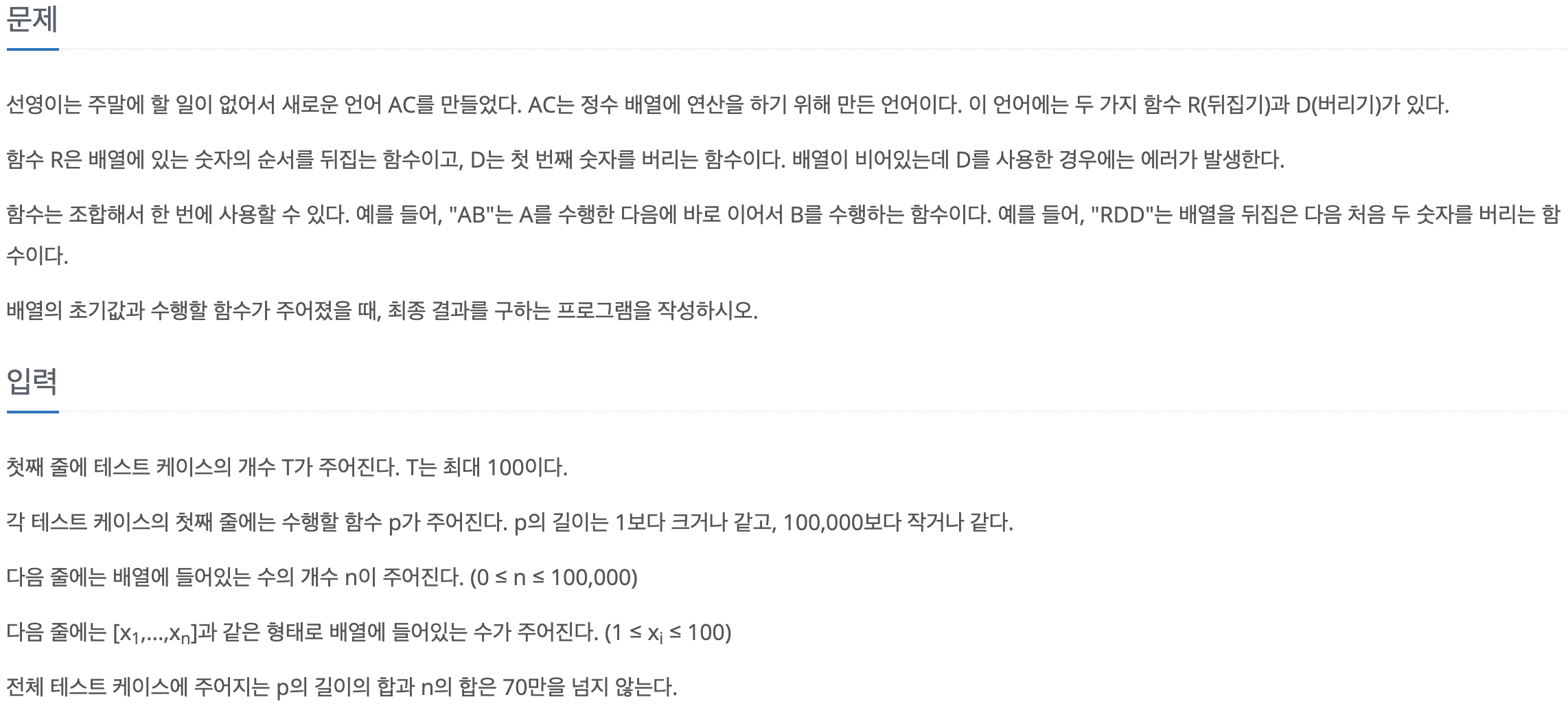 그 후 flag2 값 체크를 통해 에러가 발생했다면 error 메시지를 출력하고 그렇지 않다면 덱을 리스트로 바꾸어 준 후 flag1 == -1 상태라면 배열을 뒤집어 준다. 형식에 맞게 출력한다.