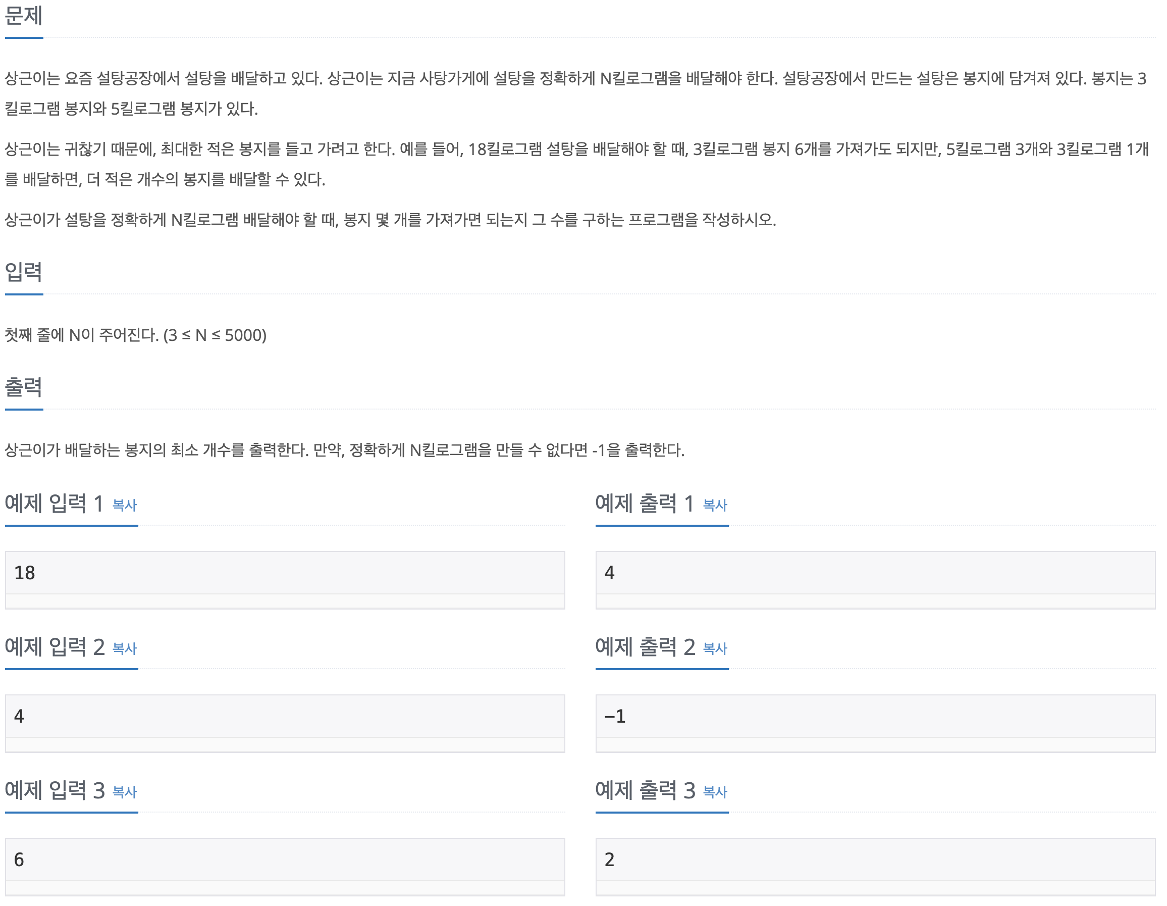 5키로의 봉지로만 나눌 수 있을 경우 그 몫을 answer에 더해준다. 나눌 수 없을 경우 3키로 봉지를 하나씩 선택하며 anwer 를 증가시켜 준다. 만약 n이 음수로 된다면 정확하게 만들지 못하는 것이므로 -1을 출력한다.