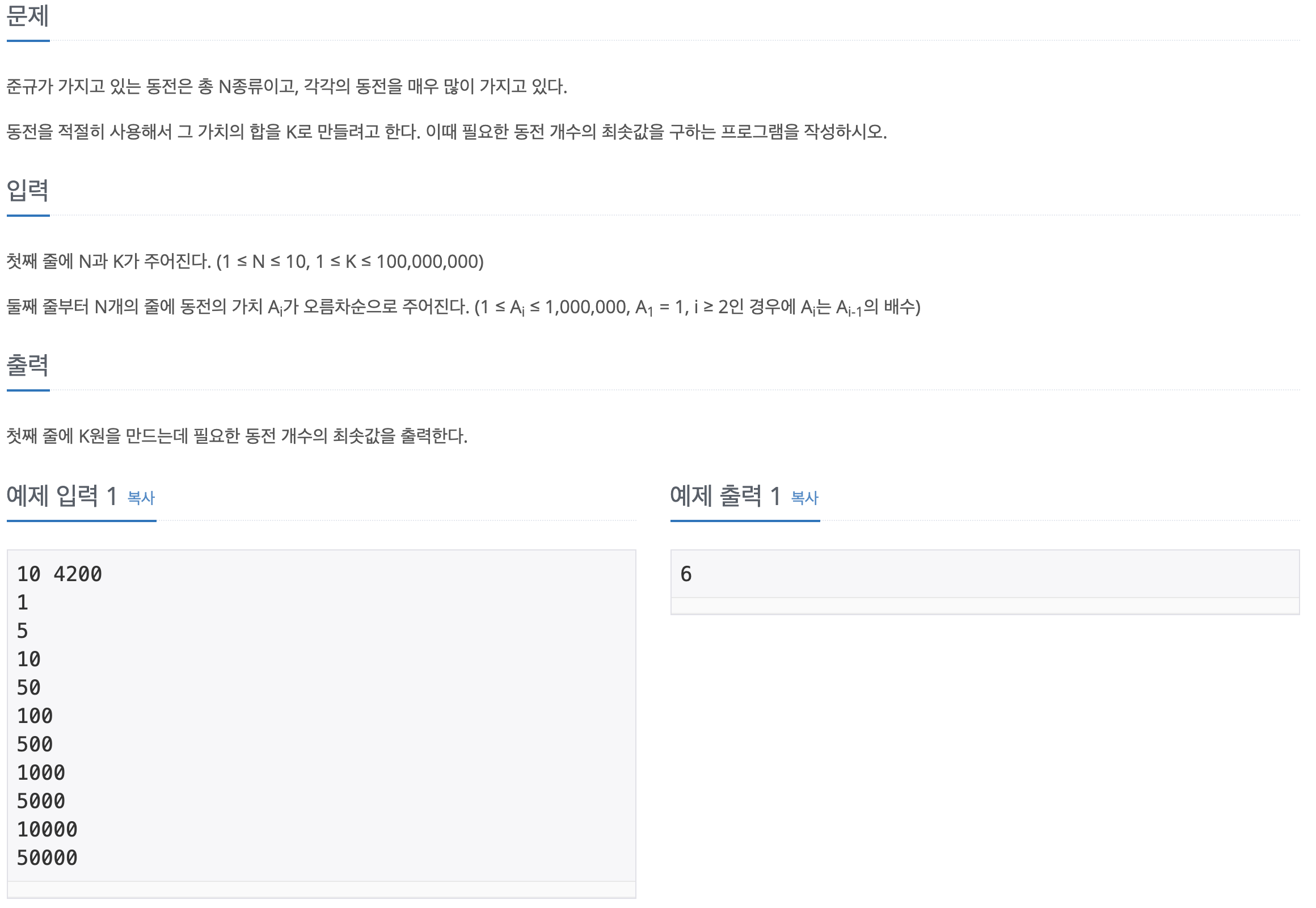 Point : 가장 높은 가치의 동전을 먼저 사용해야 하므로 뒤에서 부터 반복을 수행한다.