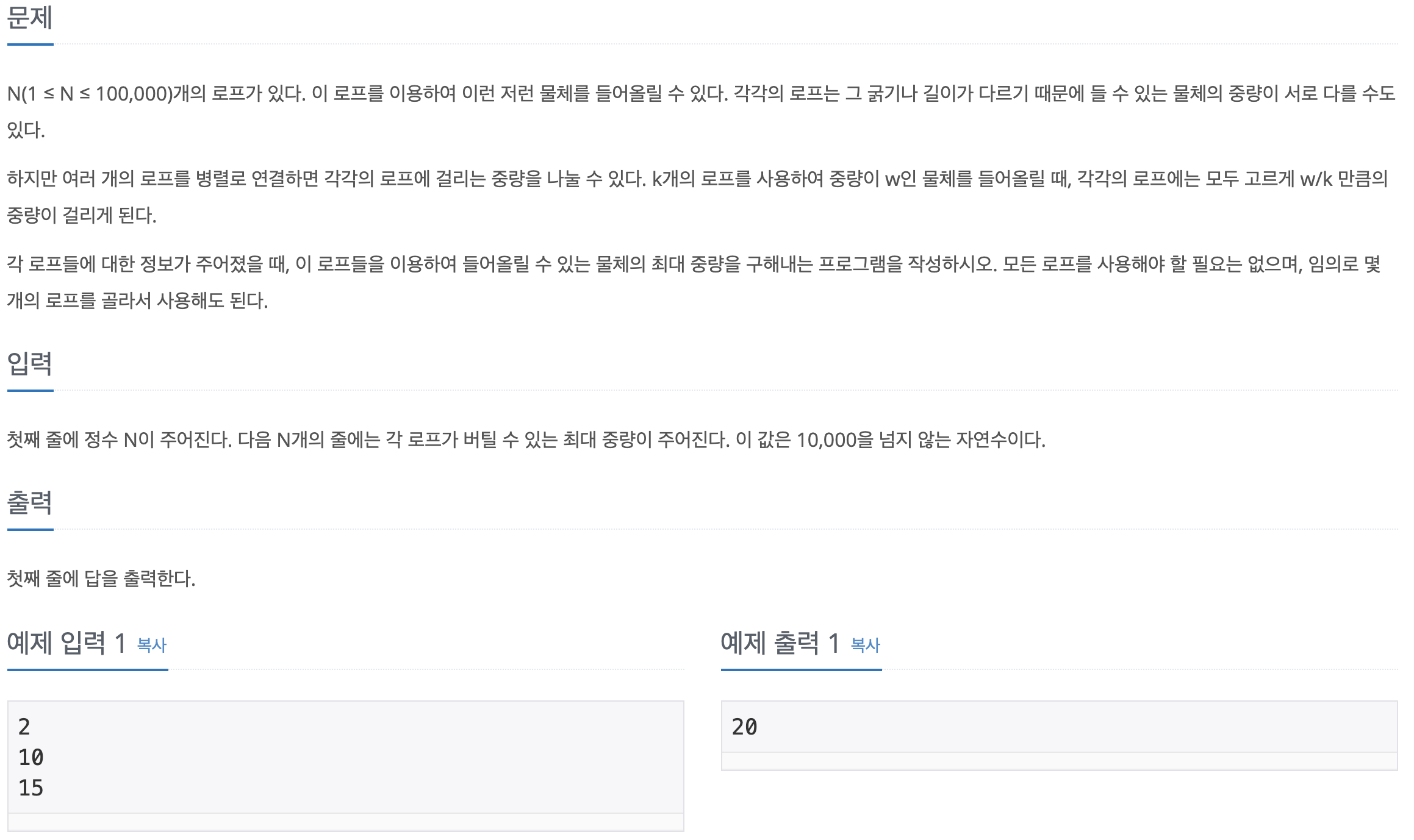 로프를 여러 개 이용할 경우 그 로프들 중 (최소 중량 * 갯수)가 최대 중량이 되므로 내림차순 정렬을 통해 큰 값부터 위치시켜 반복을 시켜주는 과정이 필요하다.