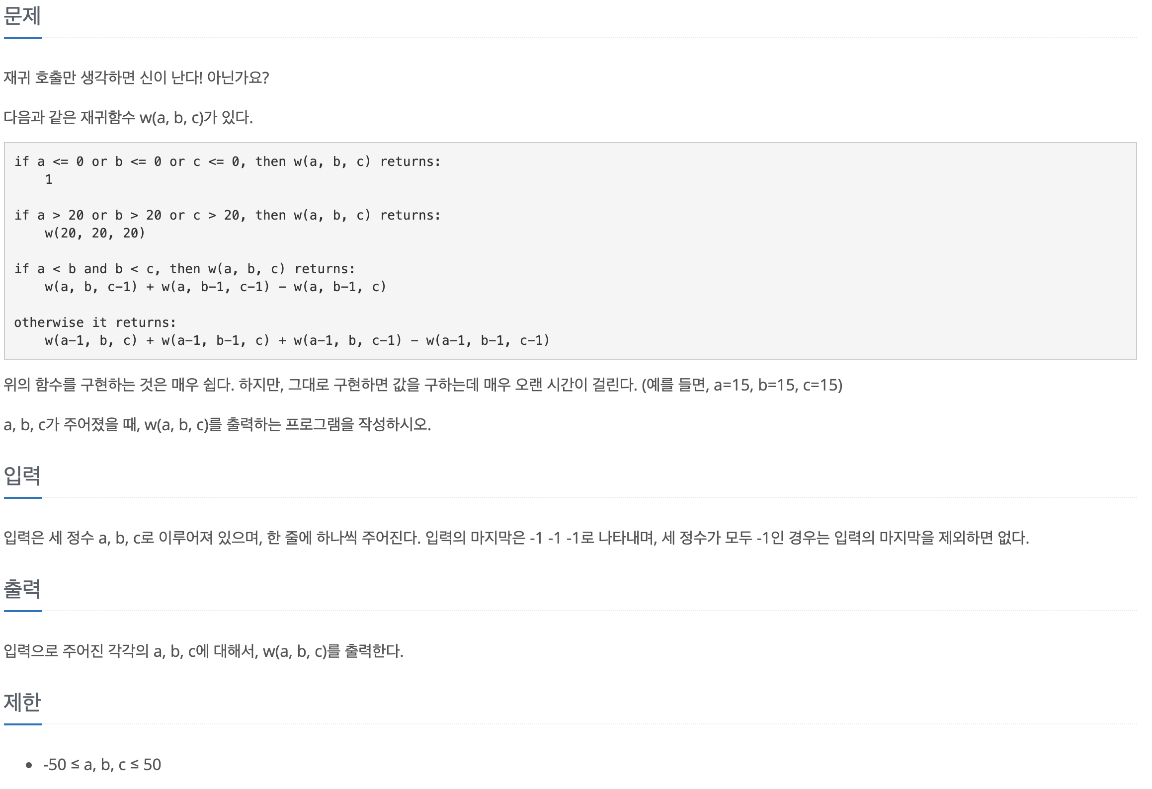 함수에서는 a, b, c 값을 인자로 받은 다음 주어진 식과 같이 0 이하라면 1을 return, 20 초과라면 w(20, 20, 20) 함수를 return 한다.