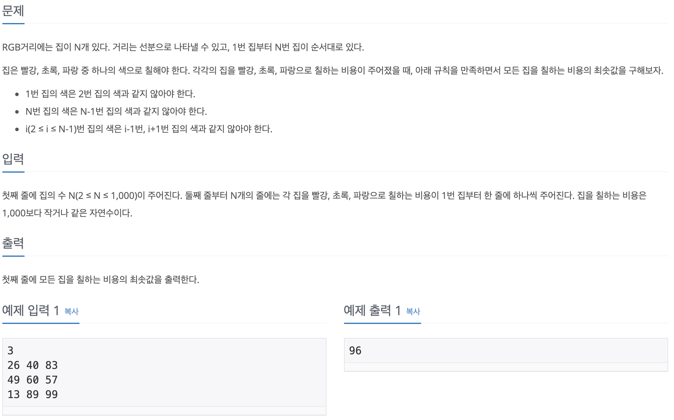 각 집을 RGB로 칠하는 비용을 먼저 리스트에 저장한다. 그 후 반복문을 돌면서 R, G, B 각각 칠하는 비용을 누적시켜 구한다.