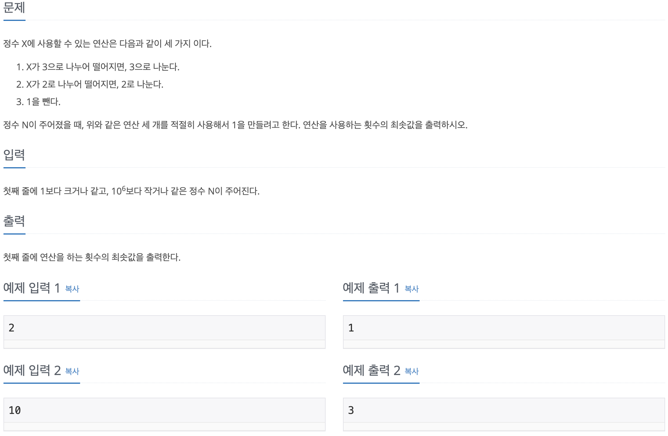 Point : 기본적으로 1을 빼는 연산의 횟수로 모두 설정하여 준다. 만약 2와 3으로 나누는 연산이 가능하다면 dp[i]의 값과 i//3에 저장된 값 + 1 을 비교하여 준다. i // 2or3 의 인덱스에 값이 저장되어 있기 때문이다.