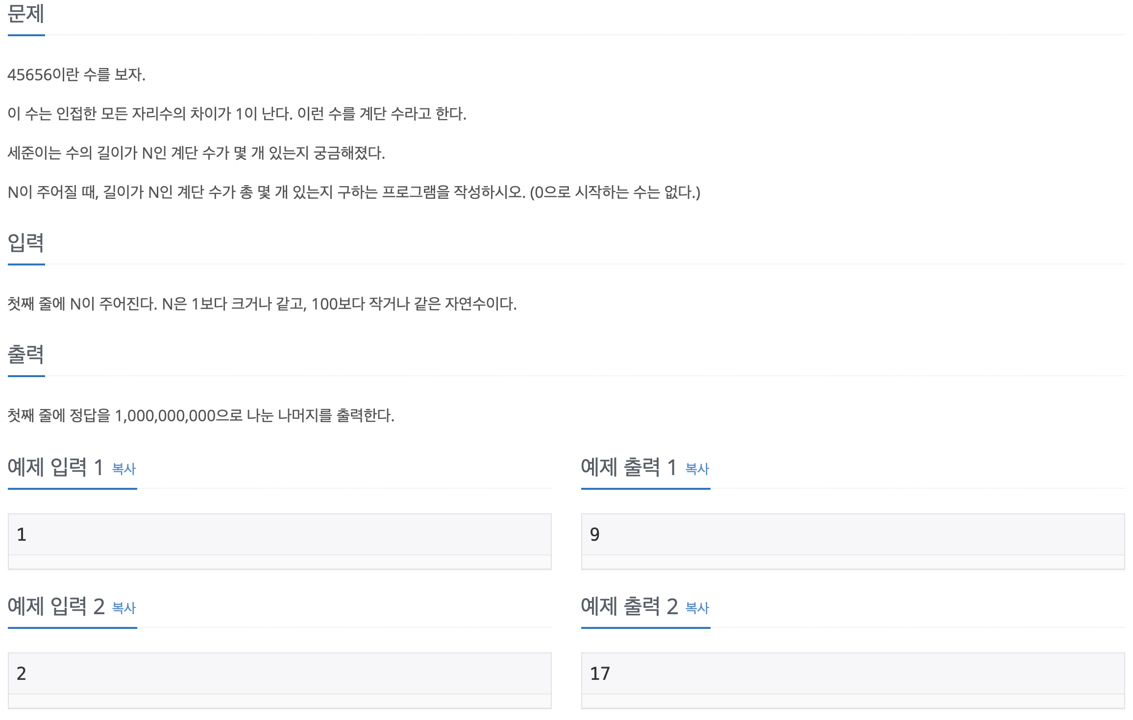 한자리 숫자일 경우에는 1~9의 인덱스 모두가 자신이 계단수 이므로 1로 초기화 하여 준다. (0 인덱스는 사용하지 않는다)
