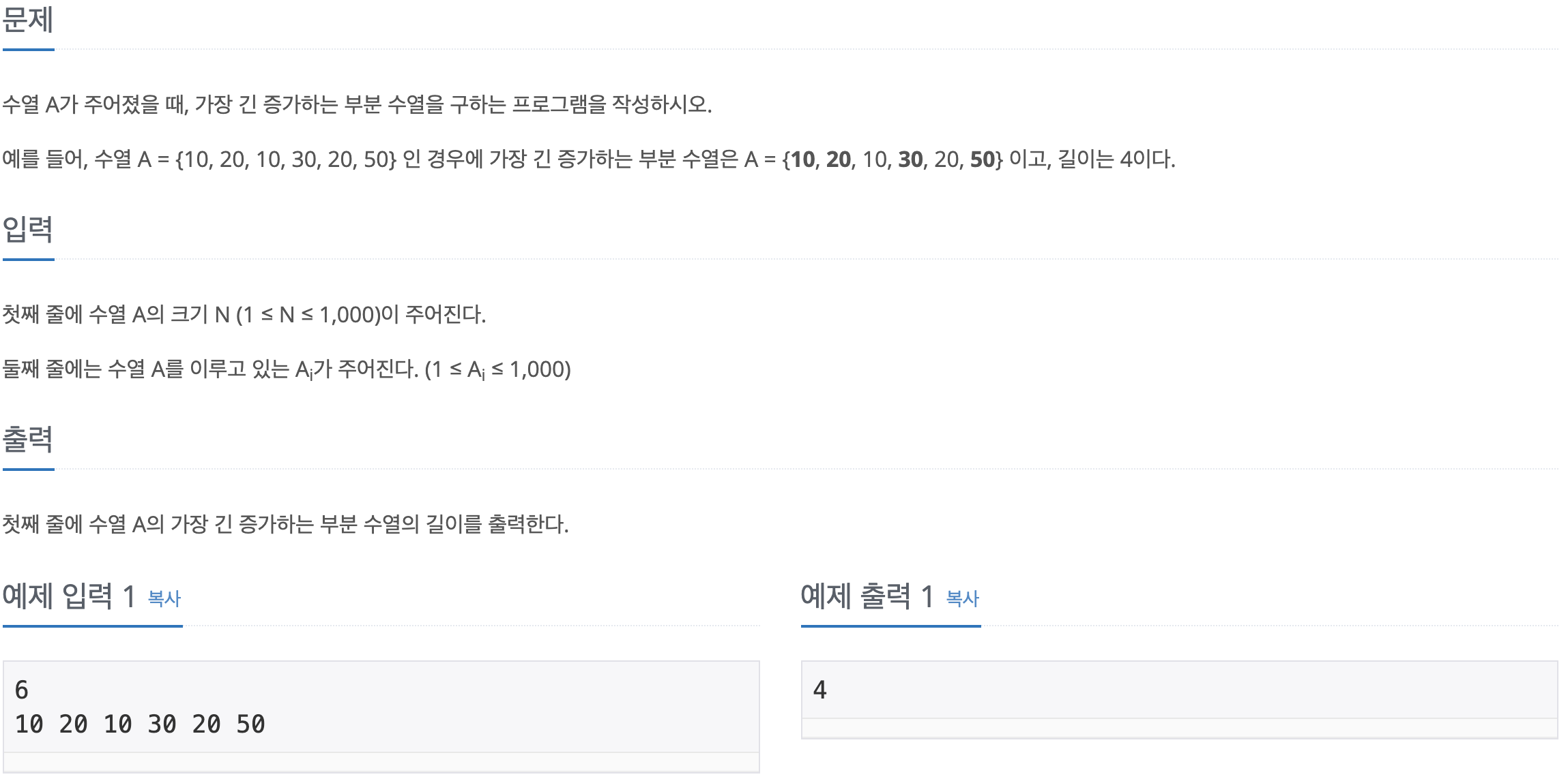 반복문 안에서 기본길이는 1로 만들어 준다. i 번째 전에 존재하는 값들 중에 i 번째의 값보다 큰 수가 존재할 경우에는 현재 i 번째의 수열 길이와 j + 1 의 수열 길이중 큰 값으로 업데이트한다.