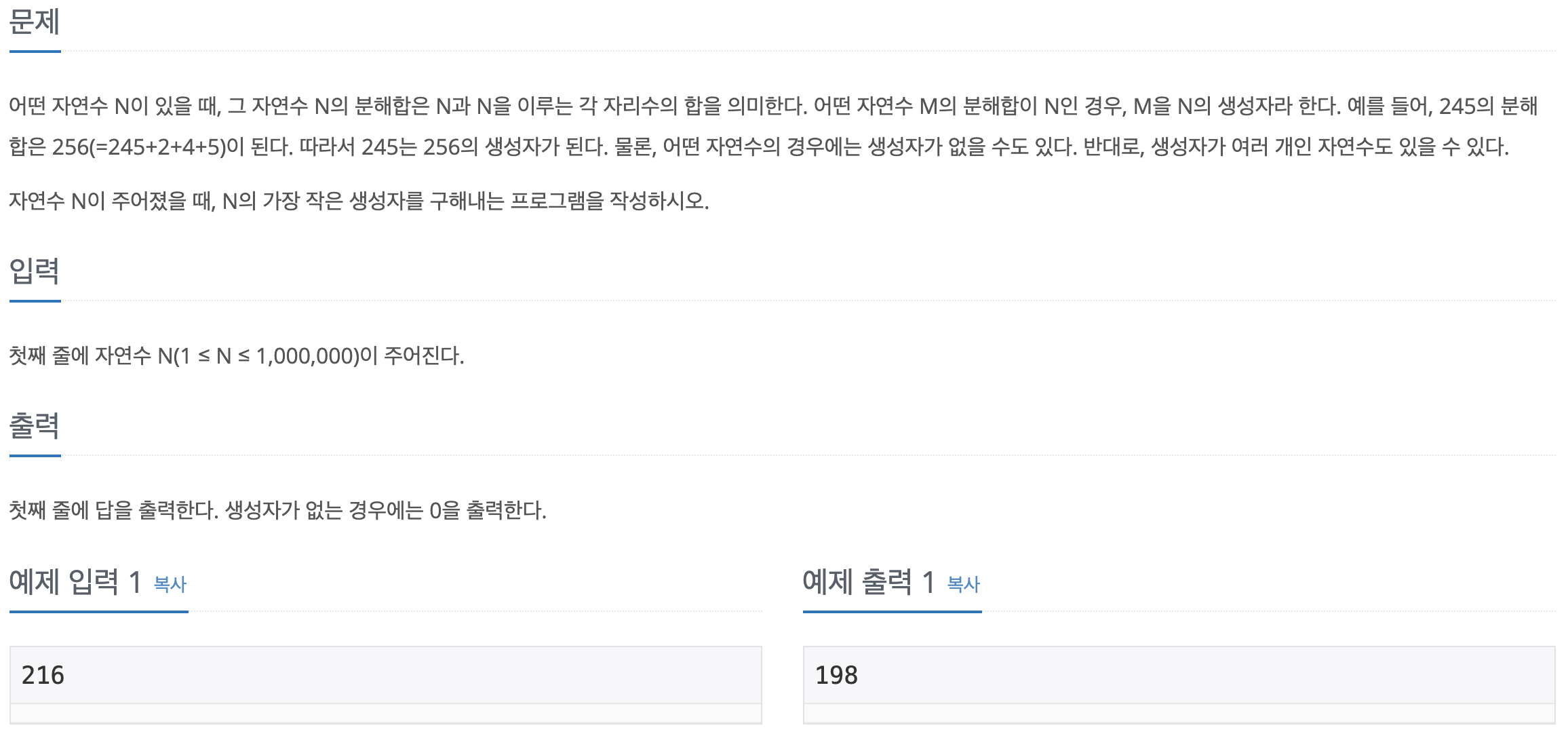Point : 숫자를 분해하는 작업을 위해 list 형으로의 변환이 필요하다. 또한 1부터 반복되기에 조건을 만족하면 그것이 바로 가장 작은 생성자가 된다.
