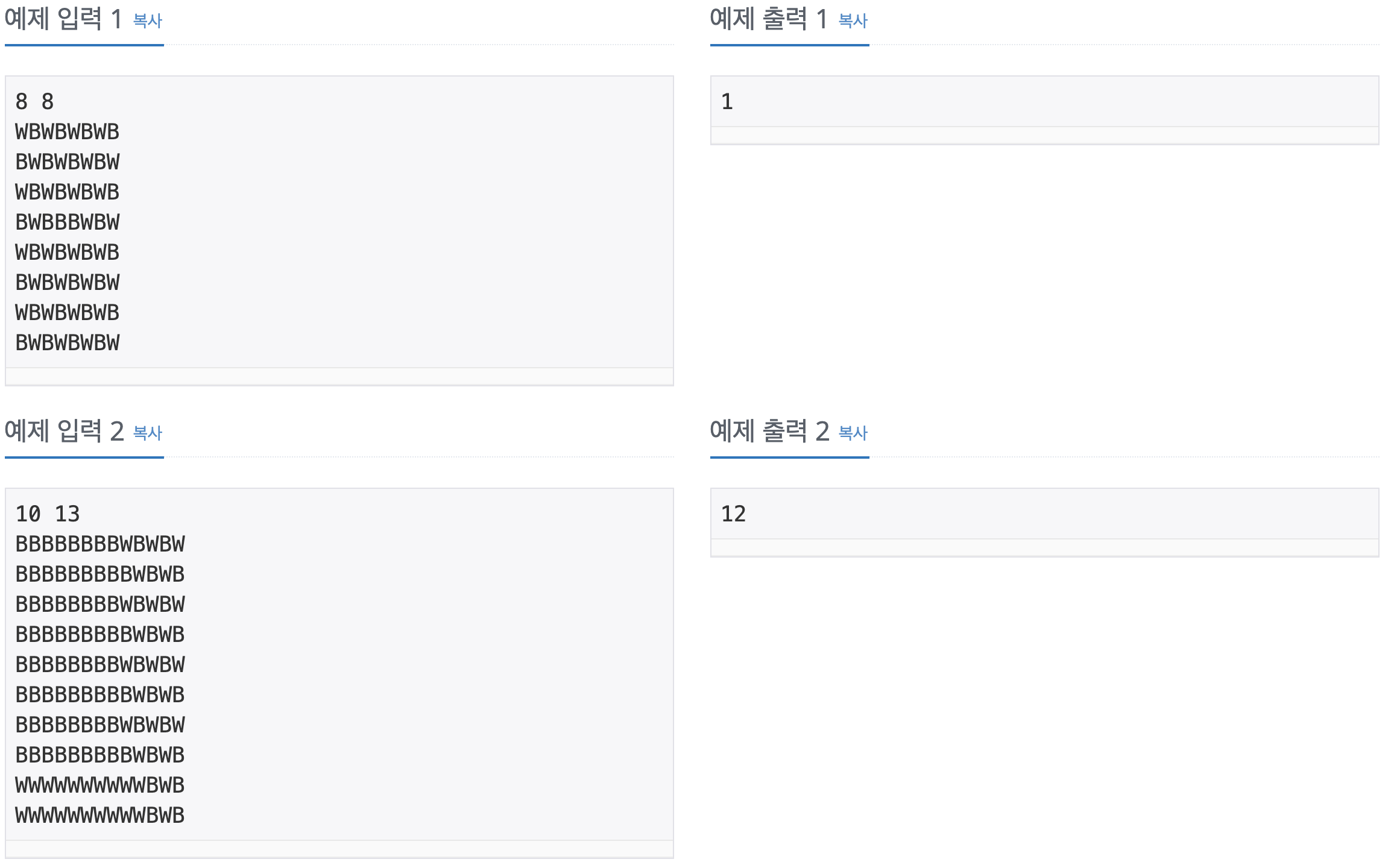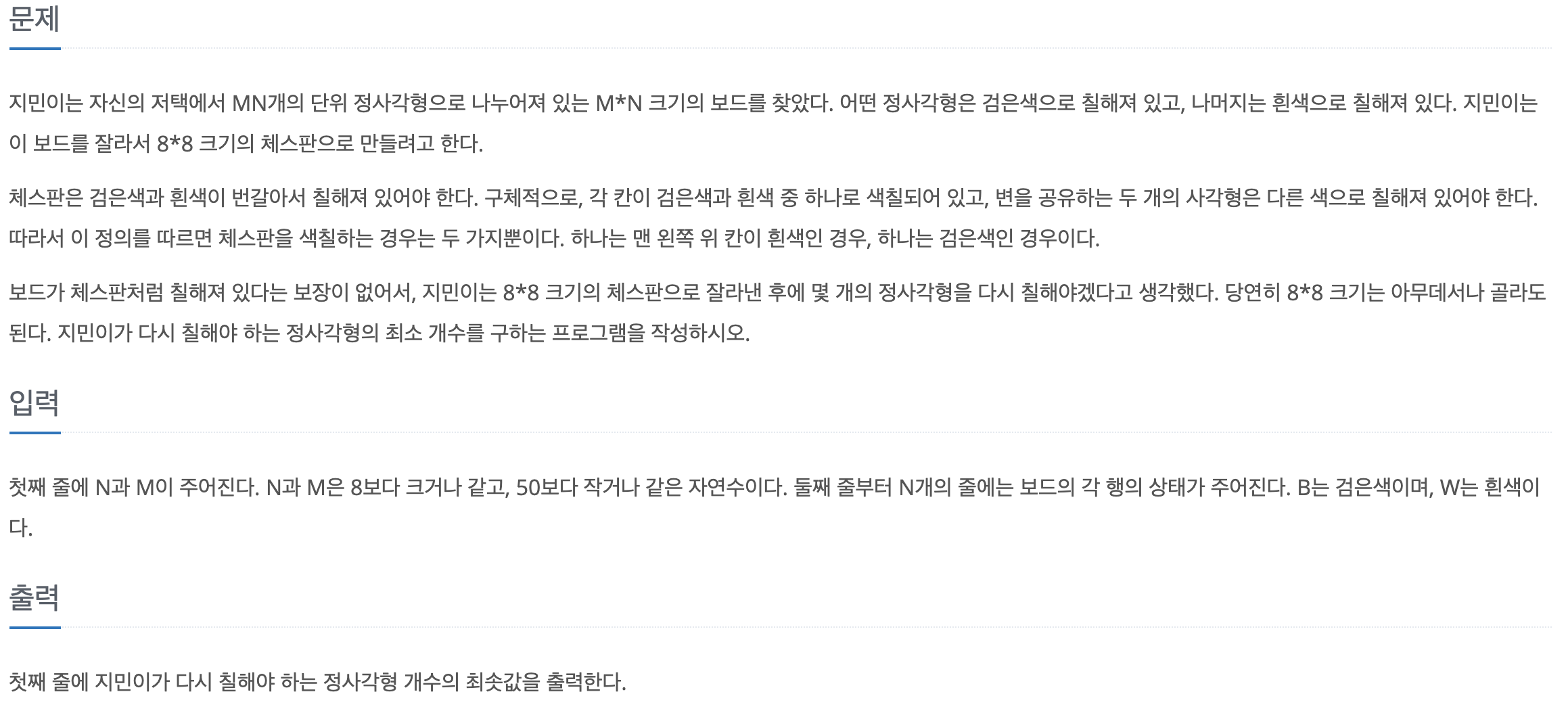 첫째 줄에 N과 M이 주어진다. N과 M은 8보다 크거나 같고, 50보다 작거나 같은 자연수이다. 둘째 줄부터 N개의 줄에는 보드의 각 행의 상태가 주어진다. B는 검은색이며, W는 흰색이다.
