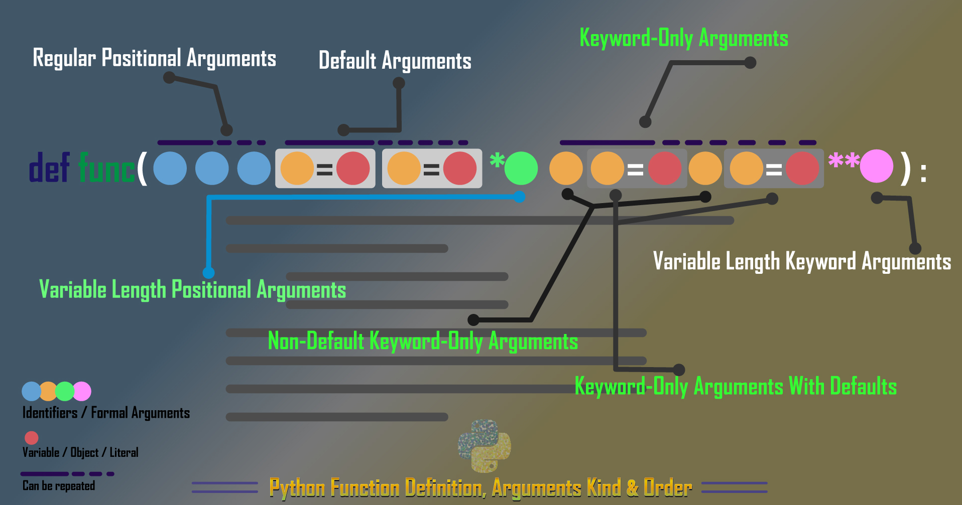 (다른 매개변수들에 의해서 이미 받아들여진 위치 인자들에 더하여) 제공될 수 있는 위치 인자들의 임의의 시퀀스를 지정한다. 이런 매개변수는 매개변수 이름에 * 를 앞에 붙여서 정의될 수 있다. 다음의 args와 같다.
