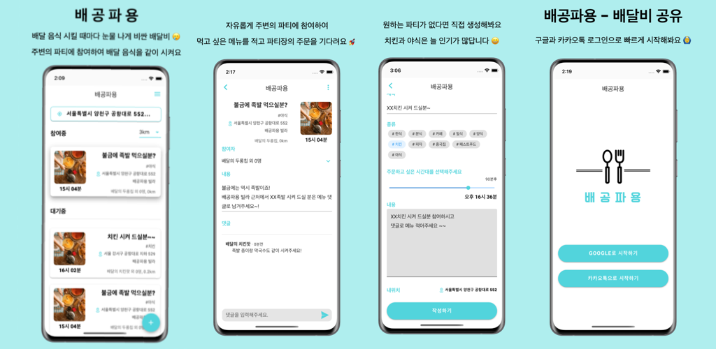 요즘처럼 배달비가 비싼 시대에는, 커피 한잔, 치킨 한마리 먹으려고 배달비 3~7천원을 더 지불하여야 합니다. 이런 문제점들을 해결하기 위해 근처의 인원들과 함께 공동 배달을 시켜 배달비를 절약할 수 있도록 파티를 만들어 주는 어플리케이션입니다.