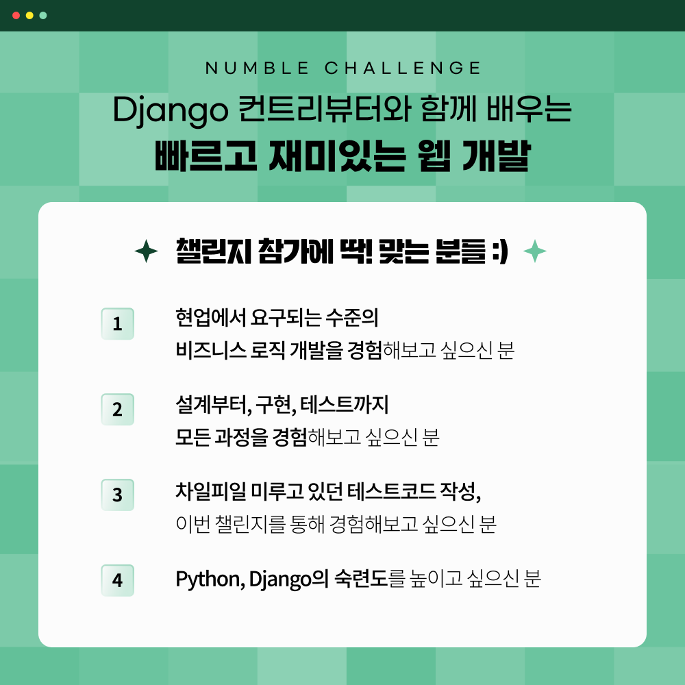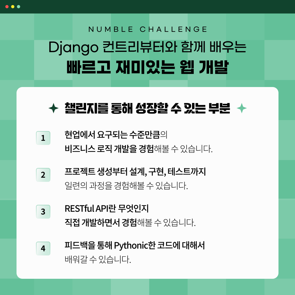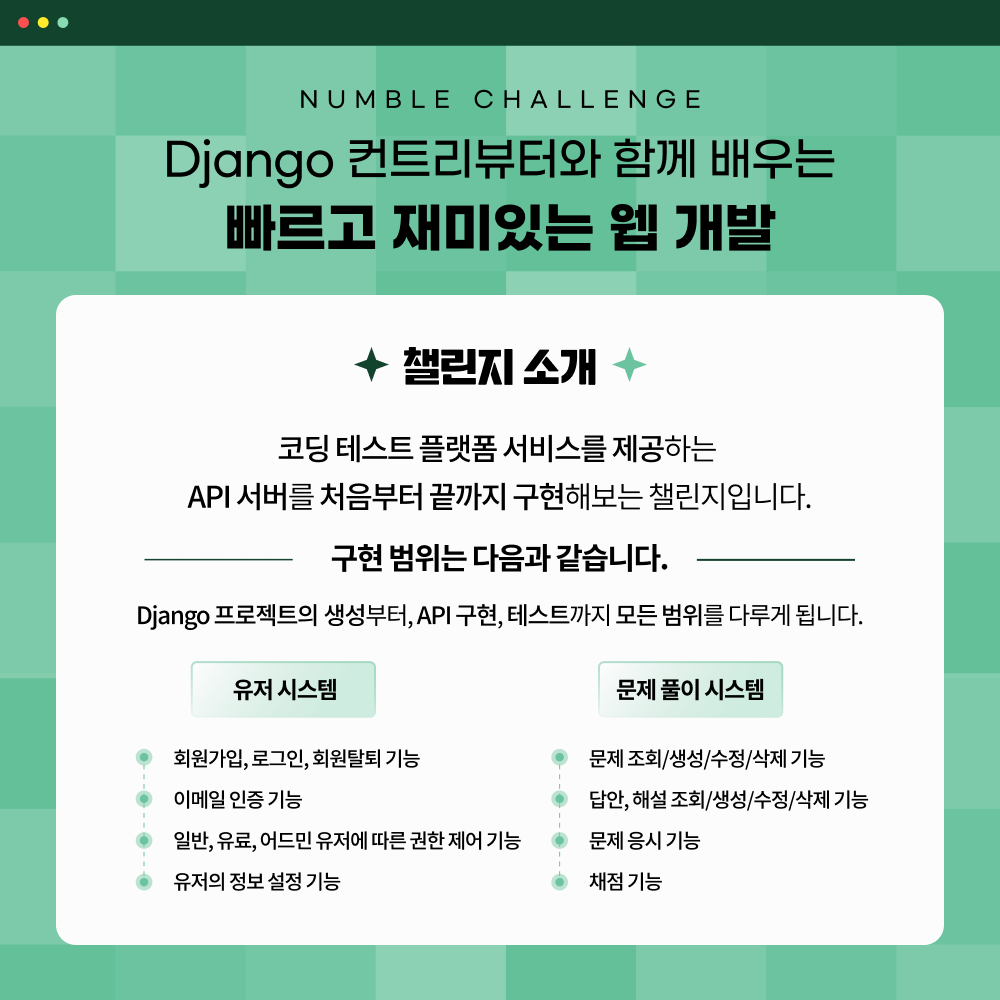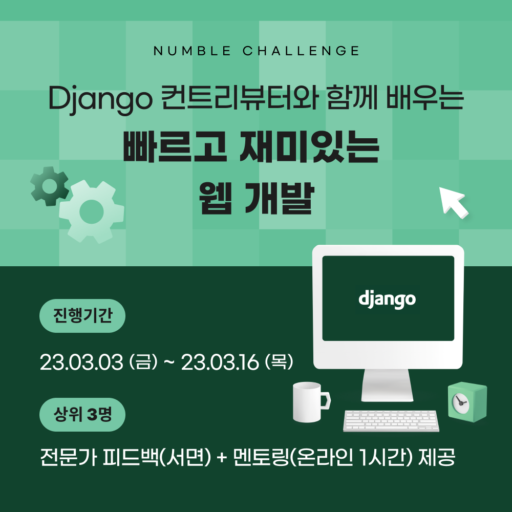 최근에 좋은 기회가 생겨서 넘블이라는 IT 프로젝트 챌린지 플랫폼에서 장고 관련된 챌린지를 오픈하게 되었습니다!!